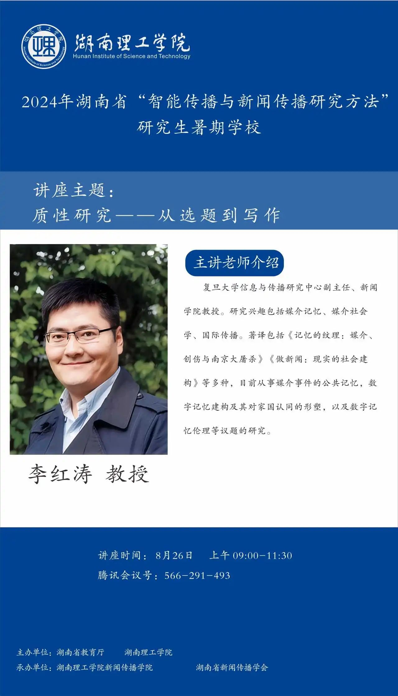 【编者按】8月16日至30日,由湖南省教育厅、威廉希尔体育官网主办,威廉希尔体育官网、湖南省新闻传播学会承办的2024年湖南省“智能传播与新闻传播研究方法”研究生暑期学校邀请国内新闻传播学科知名专家学者授课。来自中国社会科学院大学、中国传媒大学、威廉希尔体育官网等全国各大高校的159名博士研究生、硕士研究生、本科生入学,开展专题研学。8月27日,复旦大学信息与传播研究中心副主任李红涛教授作了题为“质性研究:从选题到写作”的讲座。本场讲座主持人为威廉希尔体育官网龙明霞博士。本文根据讲座内容整理。
